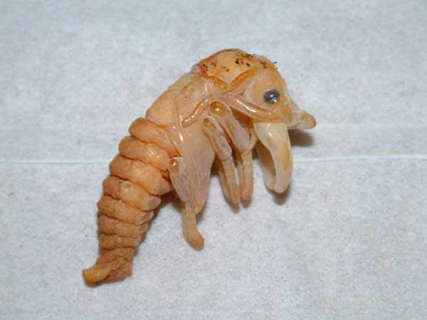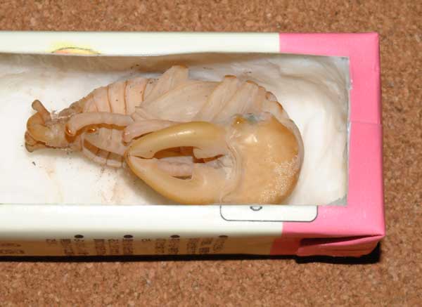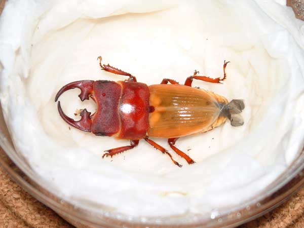 | 04_28 | ちょっと家庭内のゴタゴタがありまして日記もメールの返信も書けないままの状態で申し訳有りません…メールの返信に付きましては、近日中に必ずいたしますので…m(_ _)m プラティオドン・ネブトの49oが羽化しました♪まだ、羽化したてですので固まって46〜47oくらいになると思います。 でも、我が家で羽化した中では最大級のモノでとても嬉しいです!前々から感じていたことなのですが、ネブトの下羽って黒いんですよねぇ〜 普通クワガタの下羽って透明か黄色なのですがネブトだけは、僕が見た限りでは全種類が黒いんですよ。 コレがネブトの特徴なんでしょうか? 詳しい方がみえたら教えて下さい。 あぁ〜ネブトコーナーも更新しなきゃ…極太アゴのスマトラヒラタも写真撮らなきゃ…(自滅中 画像 : プラティオドンネブト羽化直後49o下羽黒 |