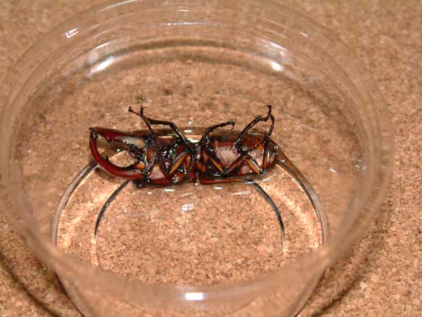 | 08_04 | すごくショックな出来事が起こってしまいました…平年なら大丈夫なはずの温室内の温度が最高41℃ににもなっていて、中に入っていた産卵セット・幼虫・新成虫etc...が全滅… 忙しさにかまけて、しっかり管理していなかった僕のミスです…毎年、大丈夫なので今年も安心していたら最近の異常高温にやられていまったみたい…(;x; 1週間に1度くらいは中を確認していたのですが、その時に限って2週間くらい放置していて…皆さんも今年の高温には気を付けて下さいね!! あいかわらず、カツラミヤマはブンブン飛んでいる?産卵する気があるんでしょうか??? 今年、羽化した岐阜産タイプAが結構イイ感じで大満足♪ この個体は、10年以上前に友達と海津で採集した♂39oと♀37oの超小型ペアの末裔です。 産まれて初めて採集した個体なので思い入れも深くF5にて、やっと75oを上回ってくれましたっ!個人的には、オオアゴが、もう少し直線的な方が好きなのですがコレはコレとして大満足な個体なのです♪ 画像 : DCB(DHB)岐阜typeA 76.2o |