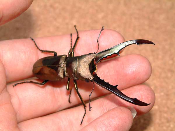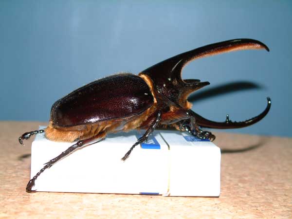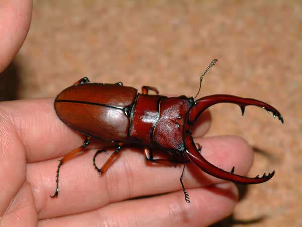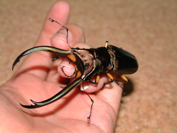 | 08_30 | 昨日、ブラック・アウトに行ってきました!編集長の話によると、入場者数は前年を上回っていたそうで、確かにもの凄い人混みでした!僕も昔、イベントに遊びに行った事があるのですが、その時と比べると今回は、ムシキングの影響か御家族が多く見られました。 僕の方はと言いますと、急きょ決まったサイン会!?当然、過去にサイン会など行った経験のない僕は不安で一杯…開場と同時に5人もの御客様がぁぁぁぁ〜!とても嬉しくなりサインをするも、その後、小一時間の間、お客さんは誰一人とも くぬぎ出版のブースへ来てくれない…不安は的中ってコトですか…と、うなだれているとクワガタの購入が終わった方々が次々と、くぬぎ出版のブースへ来て下さいましたぁぁぁぁぁぁ!!!! “うきょにょわぁぁぁぁ!?”<僕の声にならない歓喜の叫び♪(^^; よくよく考えてみれば、当然ですよね(笑) クワガタを購入するイベントなんだから皆さん、お目当てのクワガタを購入してからの御来店?なのは当たり前なのです! それからというモノ閉場するまで1回のトイレ&タバコ休憩だけで1日中サインを描いていました!!ほとんど告知もないまま開催されたサイン会なのですが皆様、足を運んで下さり本当にありがとうございました!!m(T-T)m 皆さんが、かけてくれた優しい励ましの言葉や小さな女の子が見せてくれた四季のイラスト…とても目頭が熱くなりました!!コレからも頑張りますので応援ヨロシクお願いいたします。m(_ _)m 会場内は、ほとんど見て回ることが出来なかったのですが、ブース設営中の時に少しだけ開場を見て回ることが出来ました♪とてもイイ感じの国産&ホーペのオオクワ軍団に激安ユーロミヤマ♪なんと2♂1♀F1が1万5千円で販売されてる!?幼虫1頭800円?なんじゃコノ価格はぁぁぁぁぁ!!!!メチャクチャ欲しくて後ろ髪を引かれたのですが開場前の購入はマナー違反と説明されていたので泣く泣くあきらめました。 子供がお小遣いで買える値段に設定されたオオヒラタ軍団や貴重な小型種♪ドレも魅力的でしたが、逆オークション時にウエストウッディが8千円で落札されたのにはビックリを通り越していましたよ〜思わず8千円のアナウンスと同時に手を挙げていましたが、僕はサイン中でオークション会場からは、僕が上げた手が見えるはずもなく購入は出来ませんでした…(当たり前ですね…(^^; ) 後、ネットで知り合った方やメールを何時もくれる方とお話が少ししかできなかったコトが少し心残りですね…次にお会いしたときには、一杯お話ししましょう♪ 購入したのは、念願のアスタコイデス・エラフス♪キャメロン・ハイランド産でアスタコイデスの最大種です♪ キャメロン・ハイランド…なんか魔性の響きだなぁ〜 画像 : アスタコイデス・エラフス♂73o |