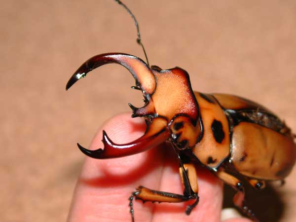 特徴は巨大化すると頭のフリル(顔上突起?)がメリーと違い、ドンドン反り返って行くところで、反り返りが強ければ強いほど隅が丸まってくるのがお洒落ぇ〜♪頭じゅんも伸びて天狗になるし、大顎の内歯も重なってきて、小型個体とは全く異なった風貌を見せてくれる憎いヤツです!! 幼虫飼育は、簡単でノコギリクワガタが大きくなる実績を持っているハイ・カロリーマットで巨大化! 注意点は、1〜3令初期までは。水分量がやや多め(ヒラタ・ノコ程度)で3令後期は、若干乾燥気味のモノに代えると羽化不全も多少緩和されます。 (最初は、水分量が多い方でウチは大きくなりました。) |