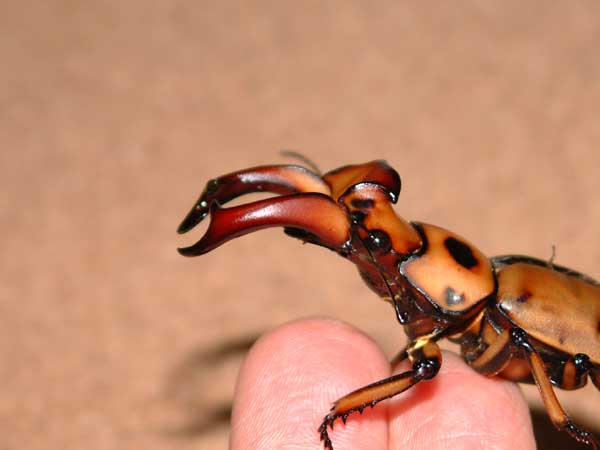 横から大顎を見ると激太です! メチャしびれます(><)/ 頭のフリルも、まるで空気抵抗を考えたスーパーカーのようにも見えてイカス!!(死語) グラディに、はさまれたことは無いのですがコレにはさまれたらメリーどころの痛さでは無いような気がします…(^^; メリーもそうなんですが羽化したての個体は淡いクリーム色でとっても綺麗です!