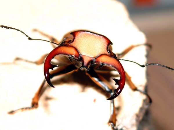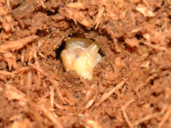 頭の所なんて、まるで三味線のバチみたいな形をしてて面白いです♪ 正面から見て推測することなのですが、頭じゅんと内歯の角度から考えるに、敵を挟み込んだら“滅殺”って、感じですねぇ〜(^^; メリーに、はさまれた時にも思ったのですが、頭のフリルにグイグイ指を押しつけてきてメチャクチャ痛かった経験がありますから、アレは飾りじゃなくて立派な武器なんでしょうね。 後、天狗ミヤマの生態に詳しい方から、お聞きした事ですが、エサが少ない時に大きく張り出した頭じゅんを使い、木の皮を削って樹液を出すそうですので、頭じゅんの形がそっくりなグラディもきっとエサが少ないときには木を削って自らエサを確保しているモノと推測できます。 メリーのフリルも同じコトが出来ると思いますし、アフリカのカナブン&ハナムグリは口の横に木を削るための小さな牙?が付いてますモンね♪虫って一見無駄な色や形をしているように見えますが、無駄は全然無いらしいですよ! グラディアトールの蛹<掘り出すと羽化不全率98%(当社比?)当然ウチは羽化不全…(;x; |
