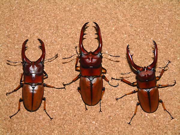 マットにも沢山の卵を産みますが、産卵材に産む傾向が強いので細くても加水してある産卵材を入れる事をお奨めします。 夏場、涼しいところに置いておけば爆産しますので要注意!産む♀なら1頭で70以上は産卵しますよ…(30℃以上には注意してね) アスタコは、ナニもしなくても爆産してくれるのにウチのギラファときたら全く産んでくれません…かと思いきやペアリングもしていない♀個体が、無精卵を爆産してくれるしペアリング中に♂は♀を次々と☆にしていくし…どうなんだか……うちのノコギリ軍団…_| ̄|○ ウチのジャワ・アスタコイデス(Mt・ゲテ)は“Prosopocoilus astacoides cinnamomeus”と言う種類で、一番好きなアスタコなのですが、他に“Prosopocoilus astacoides elaphus”と、言うアスタコ最大種がスマトラ・マレー半島周辺に生息しているのでコッチの方も飼育してみたいと思ってます。 色的にはマレー・アスタコイデスの方が綺麗かな? 後、中歯型でモーニッケ・ノコギリクワガタみたいな内歯をもった個体も羽化してきましたが、標本用に乾燥させていたら、ネコのおやつになってしまいました…残念。 生きているウチに撮影しておけばよかったと後悔しています…… |